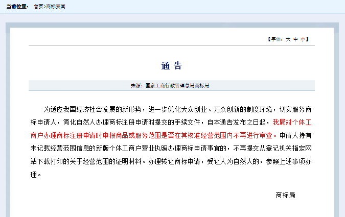 为适应我国经济社会发展的新形势,进一步优化大众创业、万众创新的制度环境,切实服务商标申请人,自本通告发布之日起,我局对以个体工商户名义办理商标注册申请时,申报商品或服务范围是否在其核准经营范围内不再进行审查。申请人持有未记载经营范围信息的新版个体工商户营业执照办理商标申请事宜的,不再提交从登记机关指定网站下载打印的关于经营范围的证明材料。
