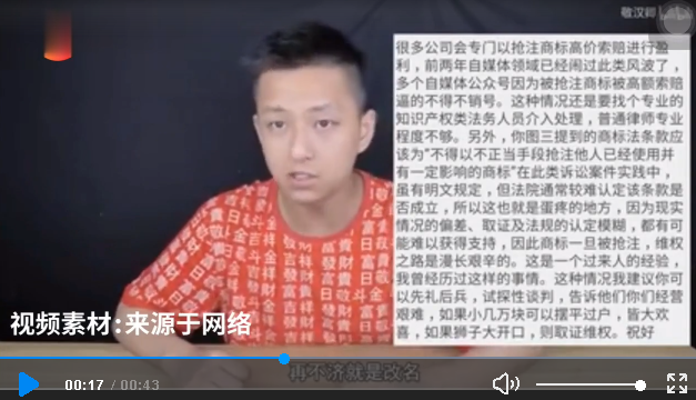 敬汉卿还告诉红星新闻,“现阶段,我已经向商标局提出了无效申请。类似的案件其实在几年前就有了,包括《papi酱》《一条》这些大体量的自媒体,也遇到过类似困扰。只是从未有人、有平台愿意站出来讨个公道。这次,B站愿意站出来给我们提供法律援助,社会各界也开始关注自媒体遭遇的商标黑产问题。我也希望大家能够团结起来一起维权,让更多受害者、媒体和平台参与进来,共同关注抢注商标的恶意行为。”