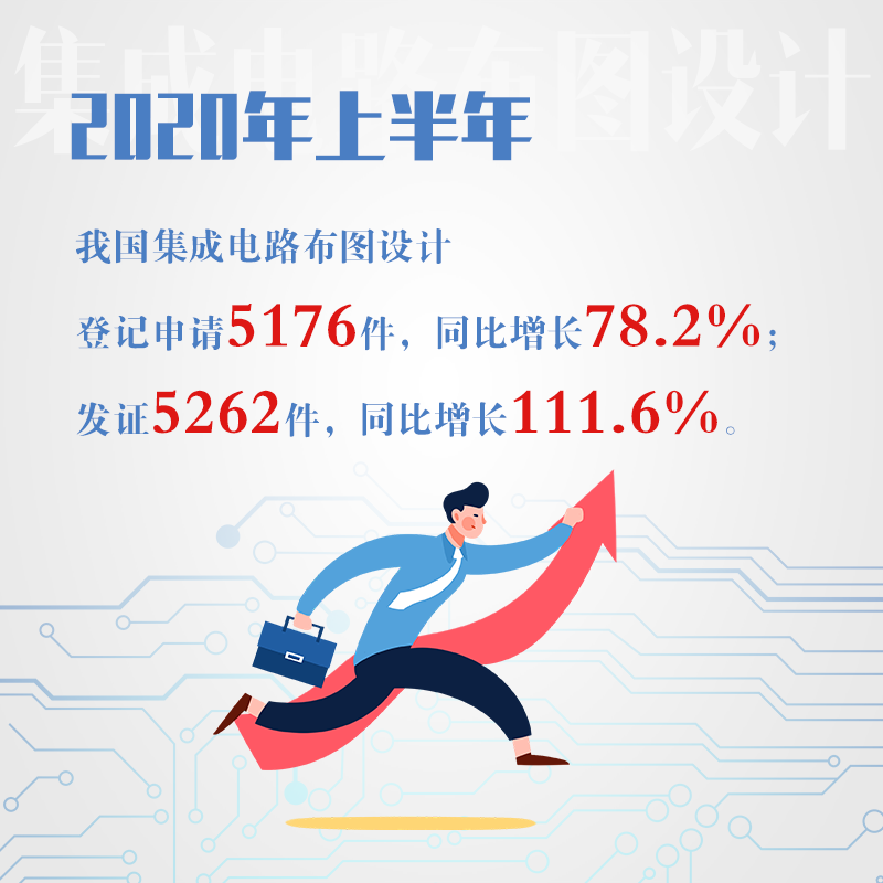 2020年上半年,我国集成电路布图设计登记申请5176件,同比增长78.2%;发证5262件,同比增长111.6%。