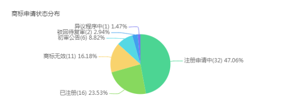 商标申请分布在各个类别,其中有23.52%的商标申请已经被审核通过。