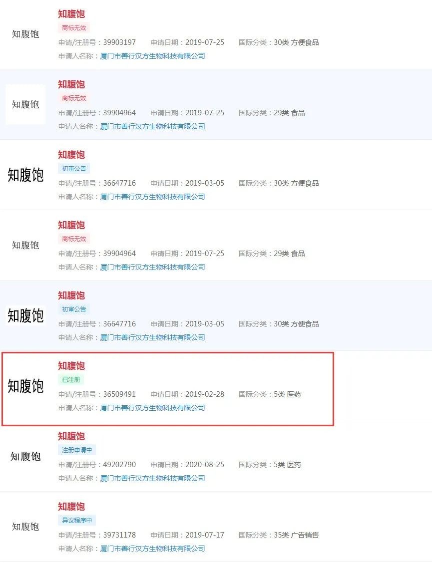 据悉,厦门市善行汉方生物科技有限公司共申请了6件“知腹饱”商标。早在2019年2月28日就已经申请了第5类“知腹饱”商标,商标已经核准注册。而第29类-食品、35类-广告销售等类别则没有那么幸运,目前处于异议程序或无效状态。
