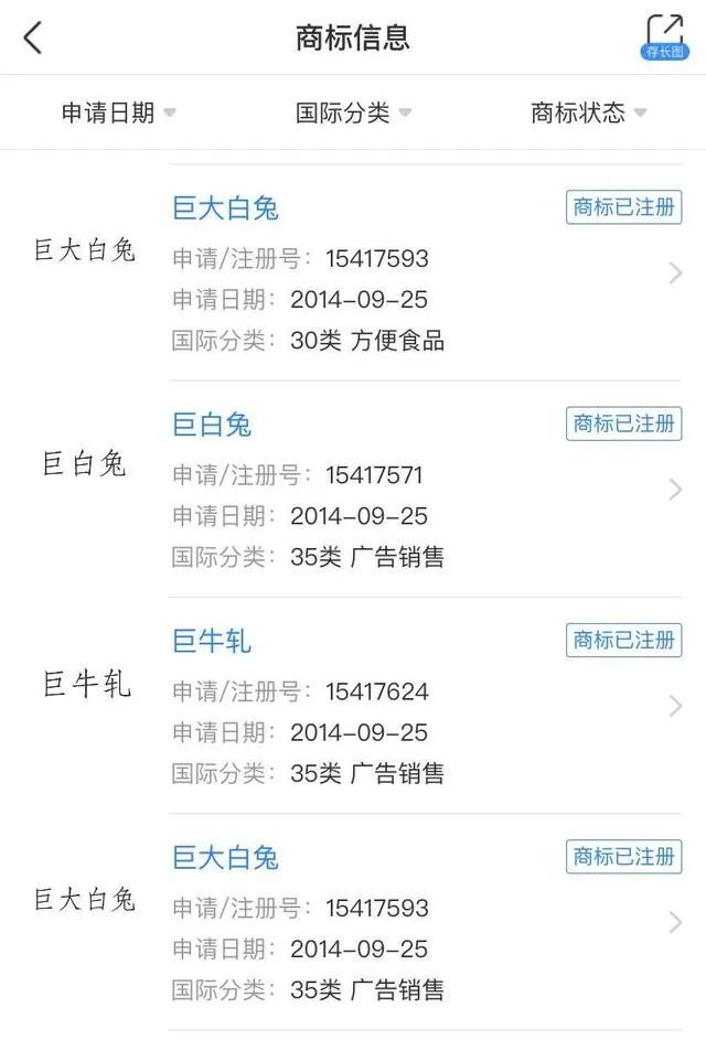 譬如,公开资料显示,著名的上海冠生园食品有限公司前后共申请了838条商标信息,其中围绕“大白兔”名称的商标非常之多,除“大白兔”以外,还申请了“巨大白兔”、“巨白兔”等商标。